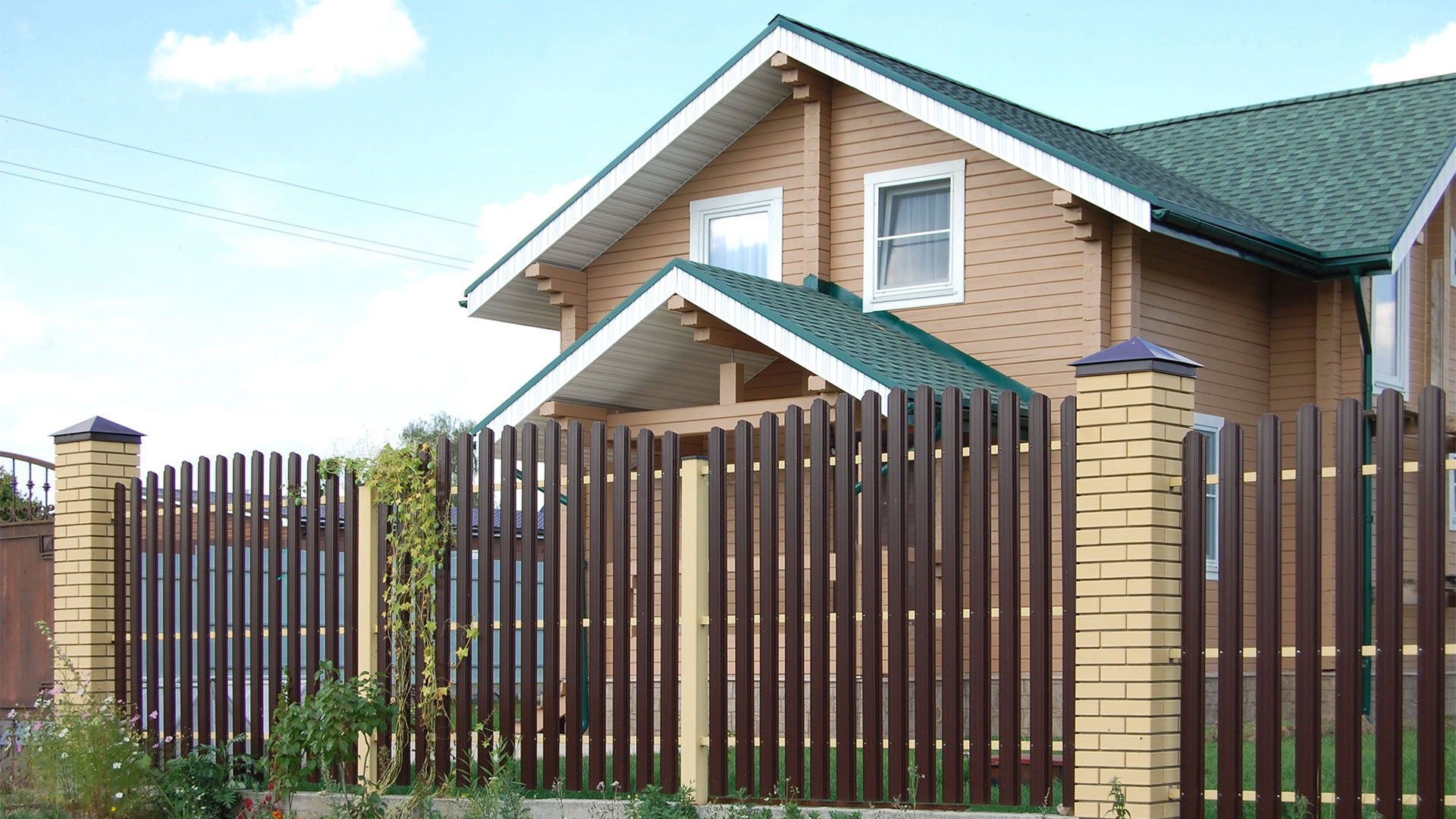 Заборы и ограждения из евроштакетника с кирпичными столбами 30 соток в Шацке
